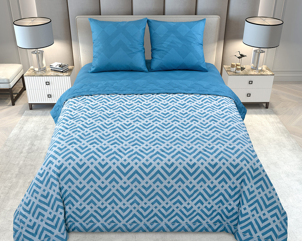 Преимущества данного комплекта в том, что стёганые изделия практичны в использовании. Заправленные подушки в стеганые наволочки можно использовать как декоративные. А одеяло одновременно полностью справиться с функцией покрывала.